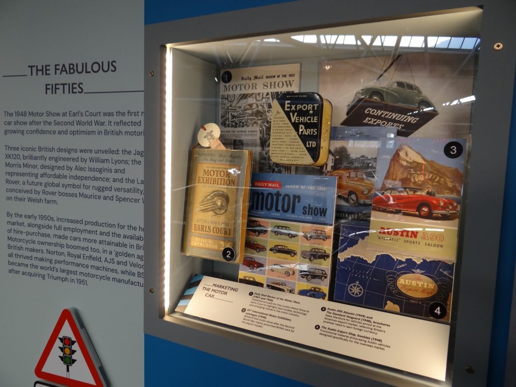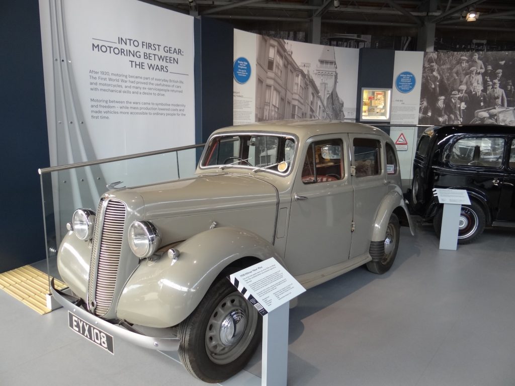 Moving on, the 1920s and 1930s are covered by Handbrake Off: Motoring Between the Wars. This section shows how mass production lowered costs and made vehicles more accessible to ordinary people for the first time. Included in the exhibition is a 1923 Calcott 11.9hp, a family car from a small British company based in Coventry.