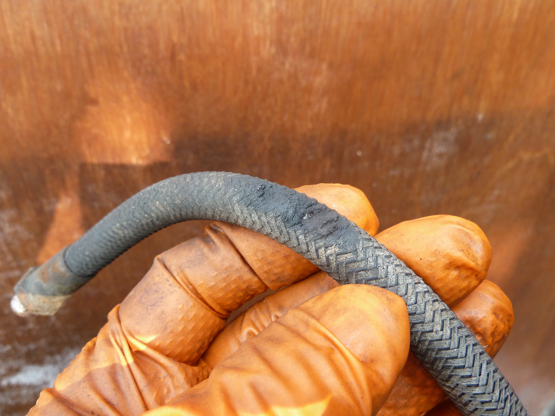 Above: This flexible hose had been chafing on the ‘chassis’, weakening the side wall of the hose. Always check to ensure that the flexible hoses, once fitted, are not in contact with any other components as the steering is turned from lock to lock.