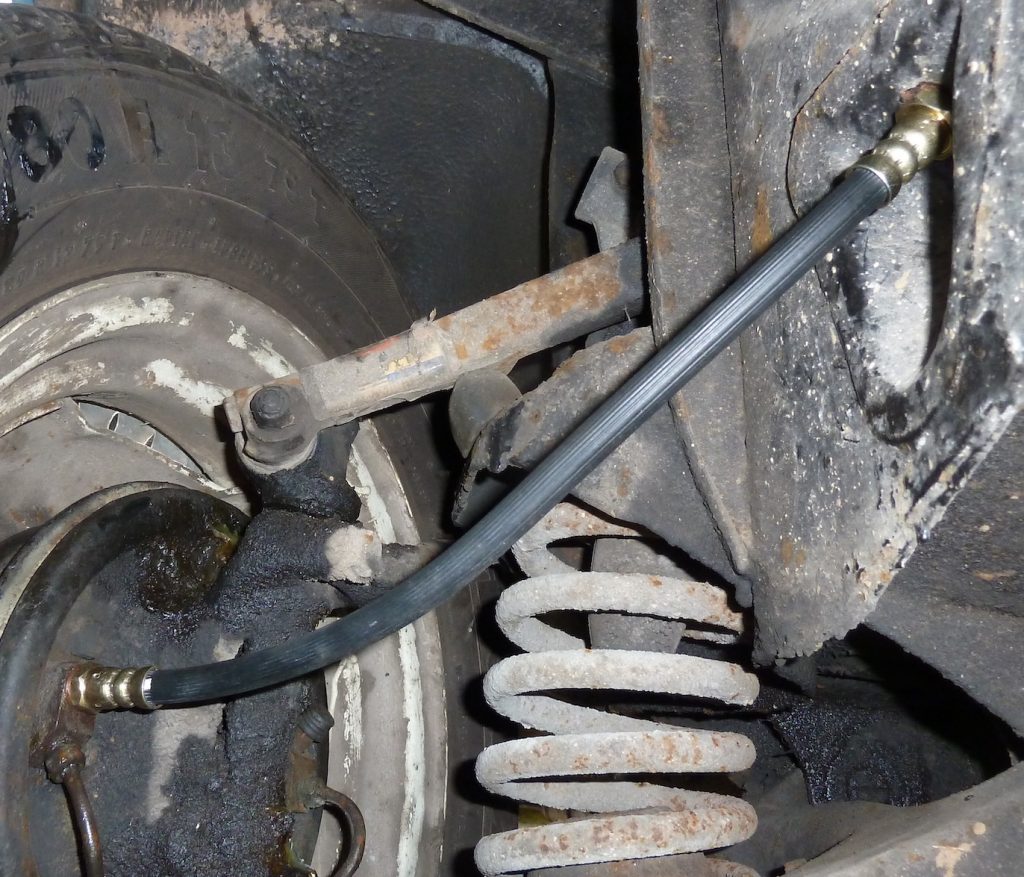 Above: This is how a new brake hose should look as fitted to the vehicle, with a smooth run, no tight curves and away from all other components.
